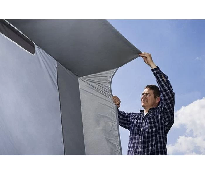 Achterwand is vast ingenaaid voorzien van een deur welke oprolbaar is zodat de tent betreden kan worden via de camperdeur.