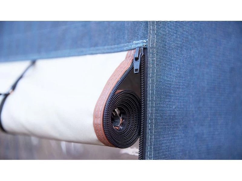 De grote ramen in de front- en zijpanelen zijn rond afgewerkt in de bovenste hoeken en zorgen samen met de hoge ramen achter in de zijwand voor voldoende licht in de gehele voortent. Het ademend Isacryl materiaal is bijzonder kleurvast en zorgt samen met de ingebouwde nokventilatie voor een prettig binnenklimaat. Op warme dagen bieden de insectenhorren in de beide zijwanden voldoende ventilatie.