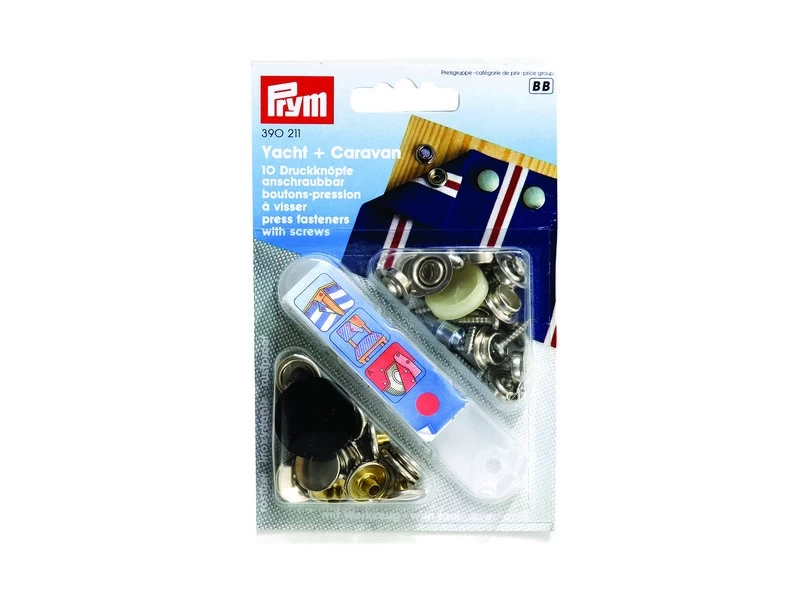 Een set van 10 drukknopen met parkerschroeven. Ter vervanging van drukknopen in voortenten. Inclusief montagegereedschap.