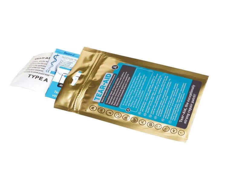 Een multifunctioneel en transparant reparatiemiddel. Tear-Aid A repareert permanent gaten en scheuren in praktisch alle materialen. Dit reparatiemiddel is extreem sterk, water- en luchtdicht, zeer elastisch, verkleurt niet en droogt niet uit. Ideaal voor permanente reparatie van een (party)tentdoek, polyester (grond-)zeilen, slaapzakken, canvas luchtbedden, self inflating matten, fietsbanden, boten, kano’s, zonneschermen, parasols, jerrycans, duikpakken, zwembaden, vliegers, jassen en tassen. Tevens is het geschikt voor gebruik op producten van aluminium, roestvrij staal, polyester en meer (behalve PVC en Vinyl, hiervoor is Tear-Aid B geschikt). De reparatieset bevat een strook Tear-Aid reparatietape (30x8cm), een verstevigingsdraad (45cm) voor reparatie van scheuren aan randen en vier alcoholdoekjes voor het reinigen van de ondergrond.